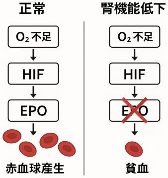 しかし、腎機能が低下すると、HIFが正常に働いても腎臓のEPO の産生能力が損なわれるため、十分な赤血球が作られず、体内の酸素運搬能力が低下して貧血が生じます。